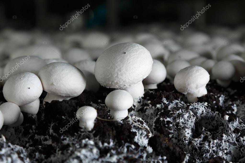 - Fresh growing chanpignons on a production