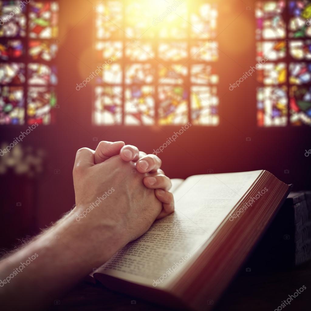 Hands folded in prayer on a Holy Bible in church concept for faith, spirtuality and religion