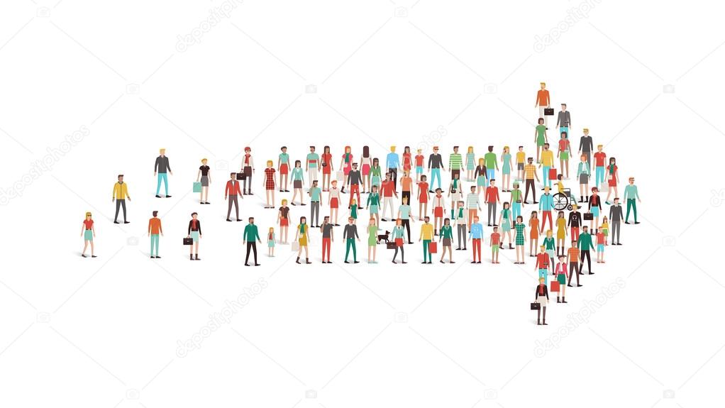 Crowd of people gathered in an arrow shape, leadership, choice and direction concept
