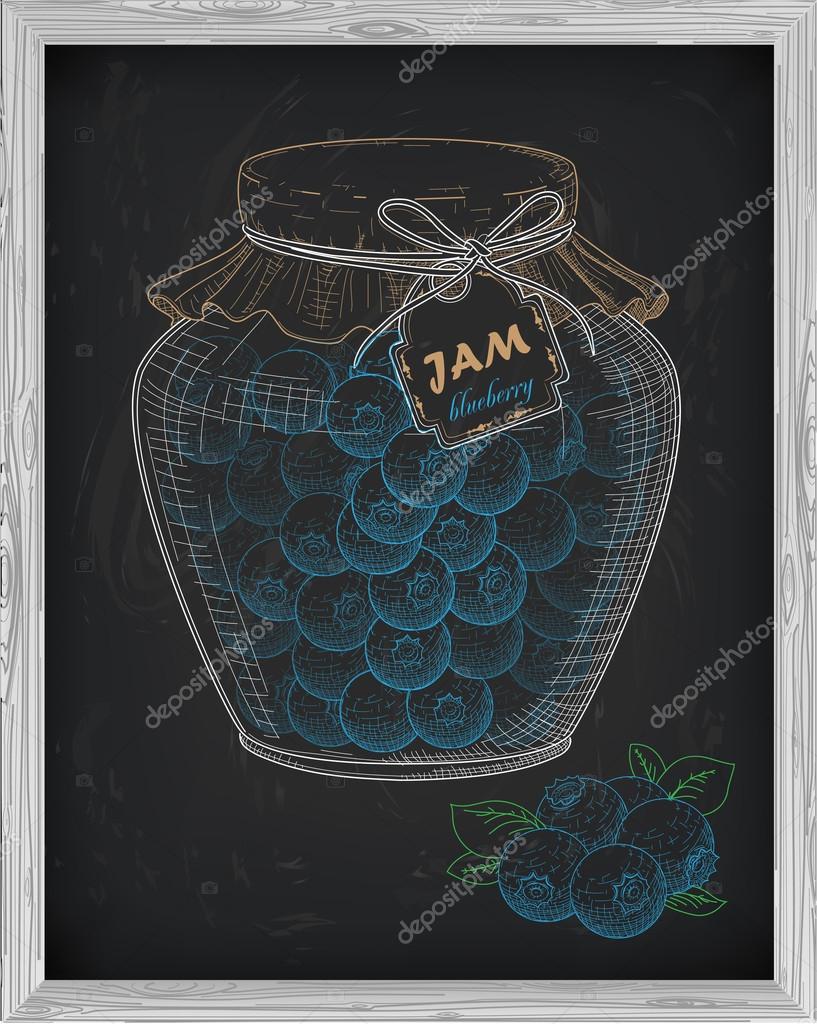 Beautiful jar of homemade jam with blueberry on a black background drawn with chalk
