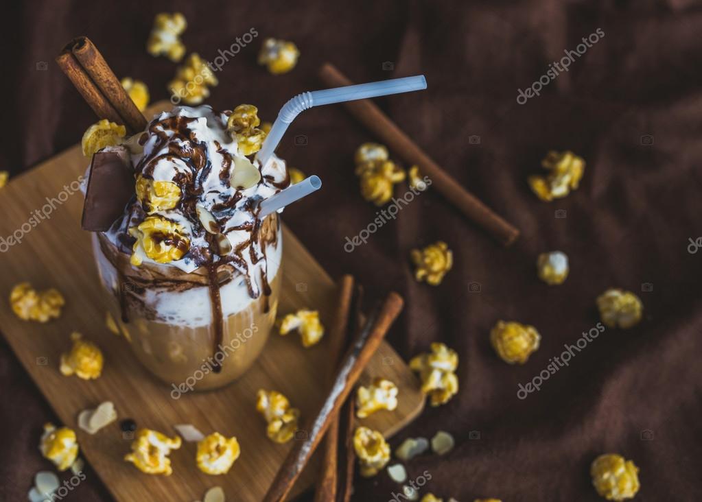 - Glass of coffee with sour cream, caramel popcorn and chocolate
