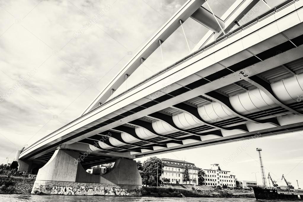 Modern Apollo bridge in Bratislava, Slovak republic. Architectural theme. Danube river. Black and white photo. Ship transportation. Infrastructure theme.