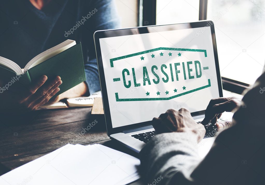 Man working with laptop, person reading book at table, text on monitor: Classified