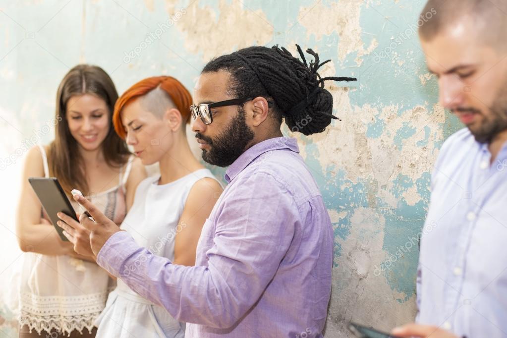 Group of young people standing in front of a grunge wall with a mobile phone and tablet hands