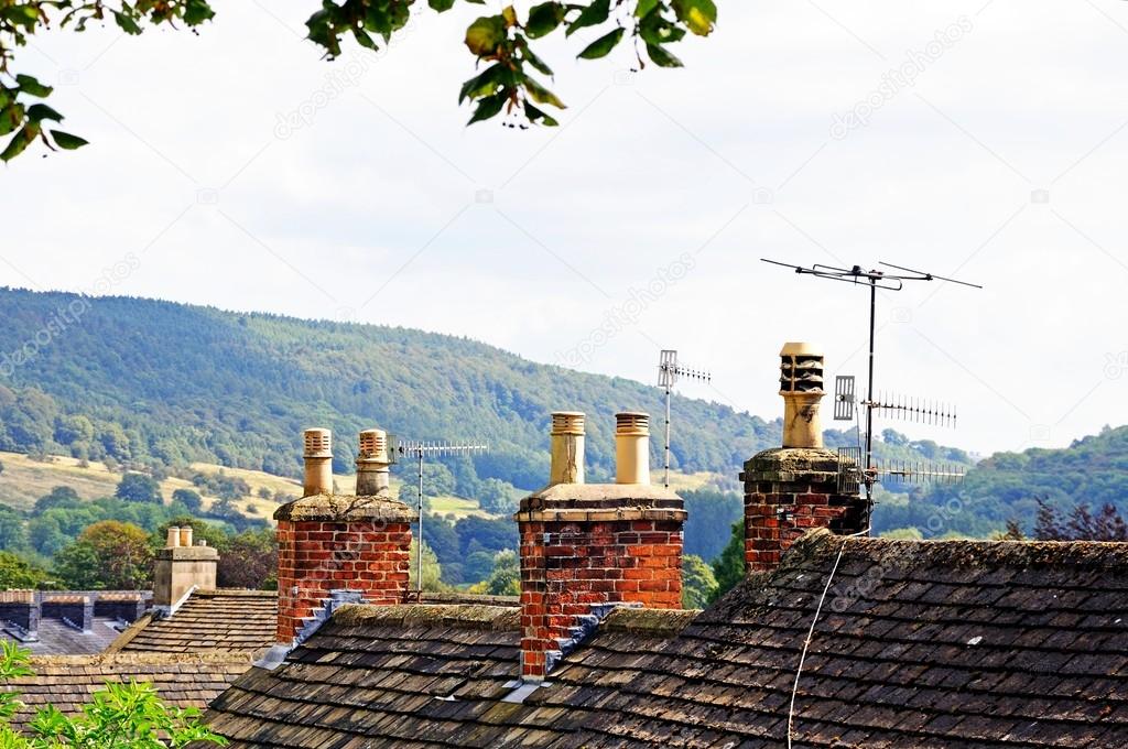 - Cottage rooftops with chimney pots, Bakewell, UK.