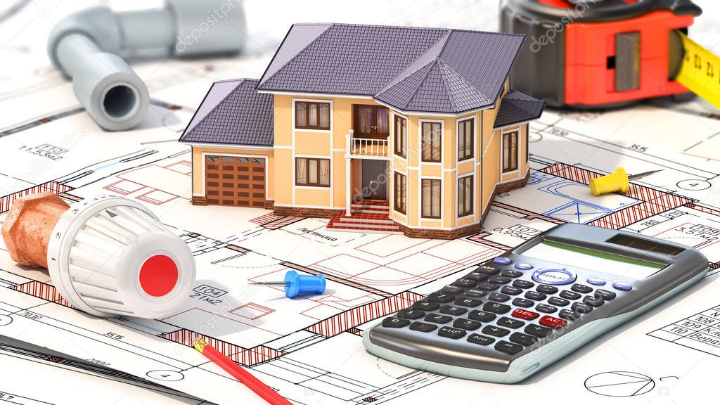 Construction concept. Project of heating for house. House with parts of heating on the blueprints. 3d illustration