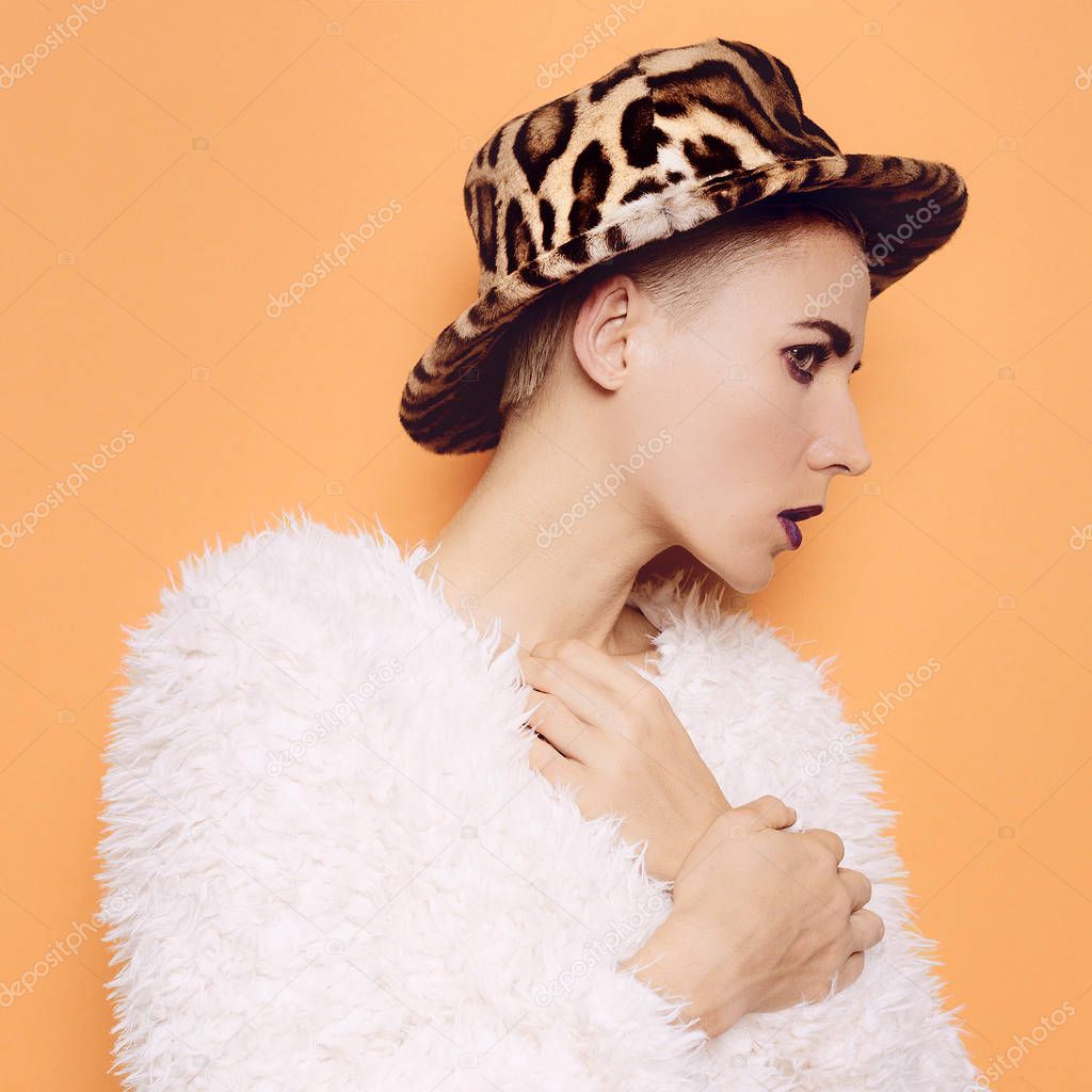 Girl in a stylish leopard hat and coat. Sexy print