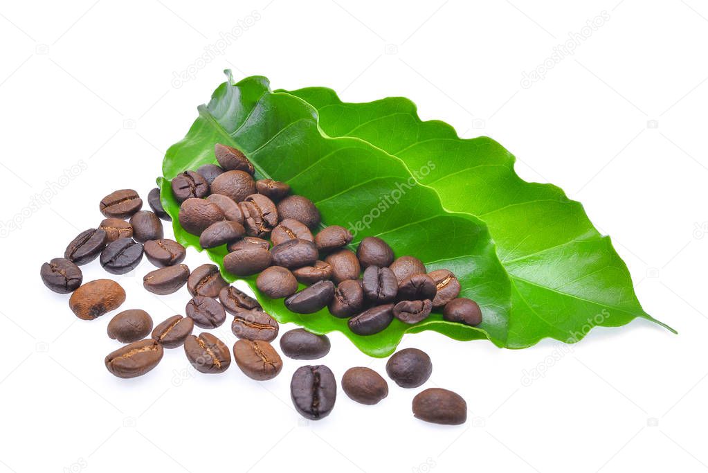 Coffee beans with green coffee leaves isolated on white background