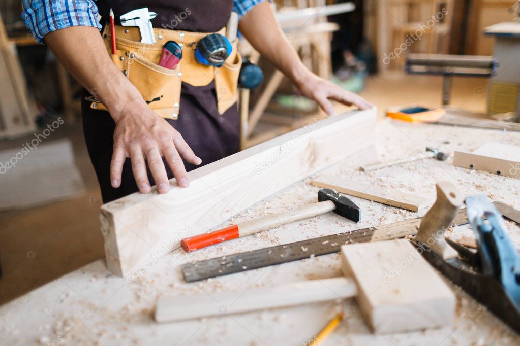 Hands of carpenter on straight wooden plank