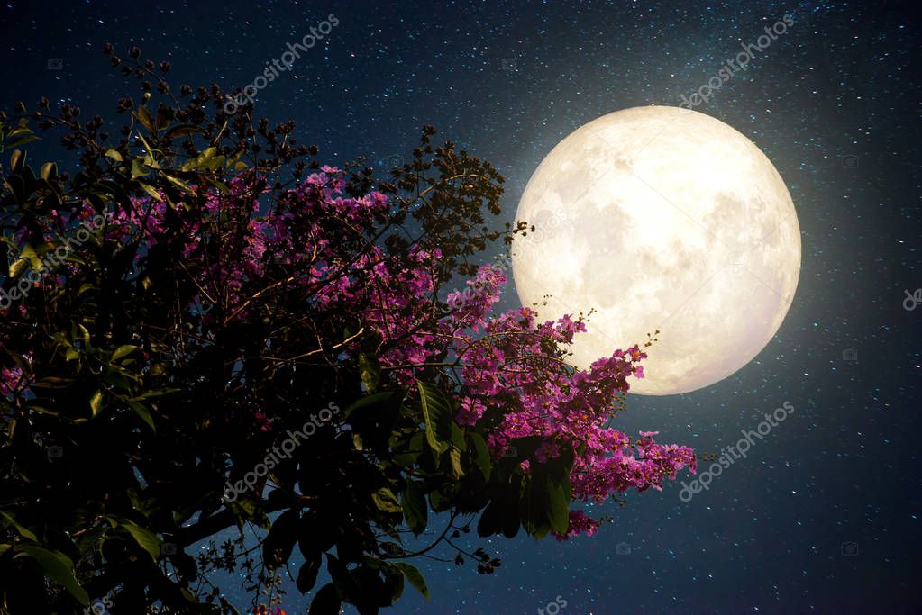 Beautiful cherry blossom (sakura flowers) with Milky Way star in night skies; full moon - Retro style artwork with vintage color tone(Elements of this moon image furnished by NASA)