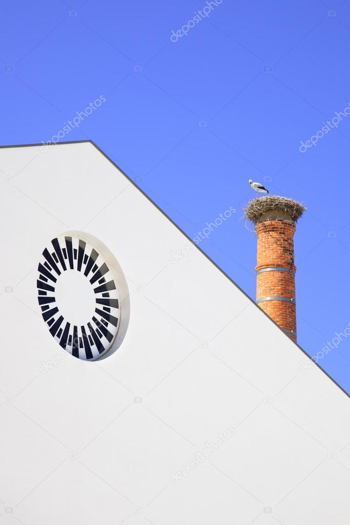 Chimney stork nest and white architecture in Algarve. Portugal.