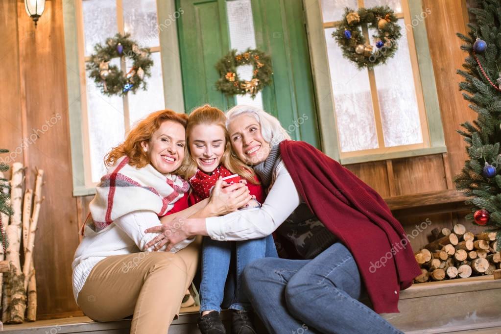 Happy family from three generations sitting on stairs and hugging while drinking hot tea