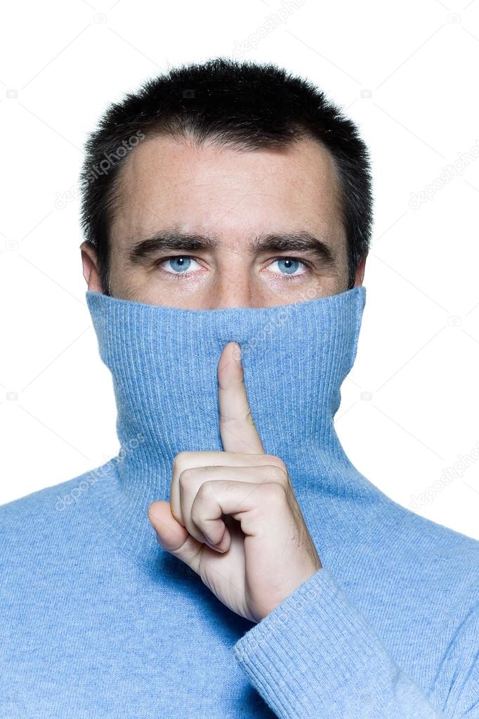 Studio portrait on isolated background of anonymous hushing man hiding behind his poloneck