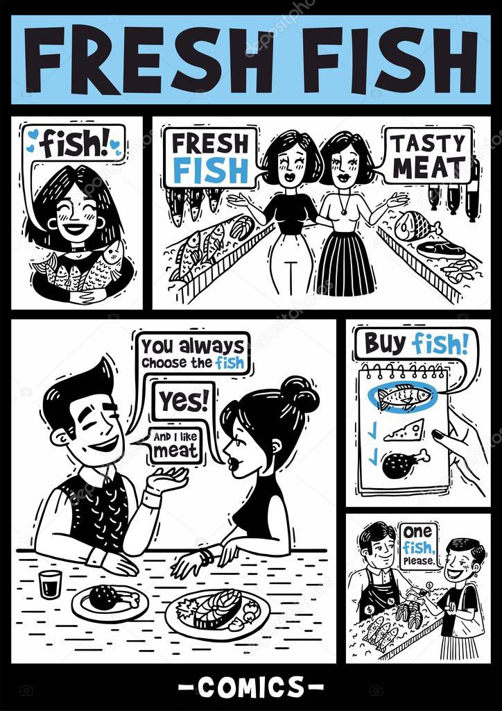 Vector comics black and white comics about people and fish