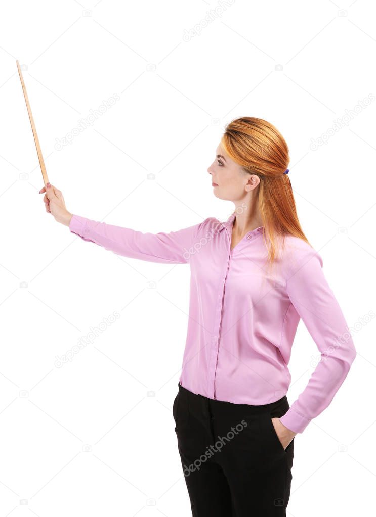 Young teacher with pointer on white background