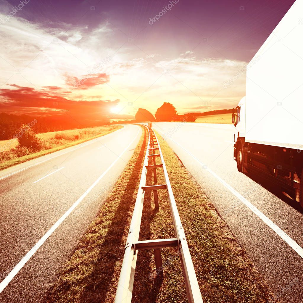 Big truck on Highway through summer fields at sunset