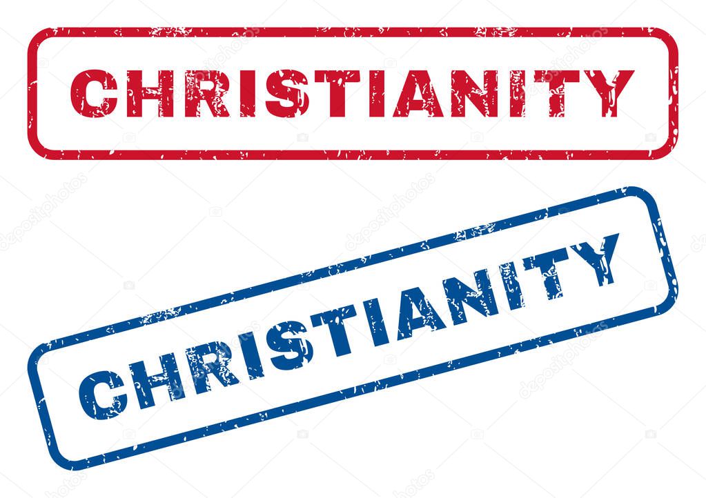 Christianity text rubber seal stamp watermarks. Vector style is blue and red ink tag inside rounded rectangular banner. Grunge design and unclean texture. Blue and red signs.