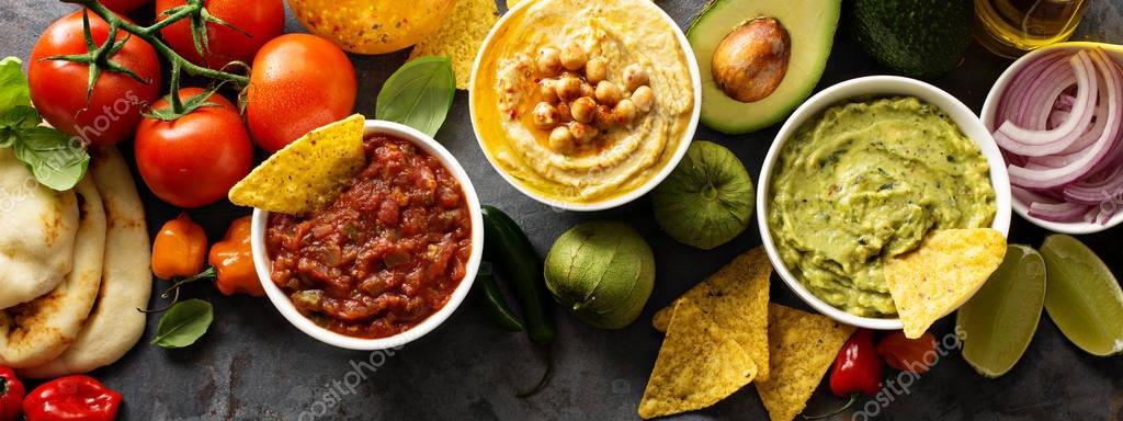 Homemade hummus, salsa and guacamole with corn chips and vegetables overhead view