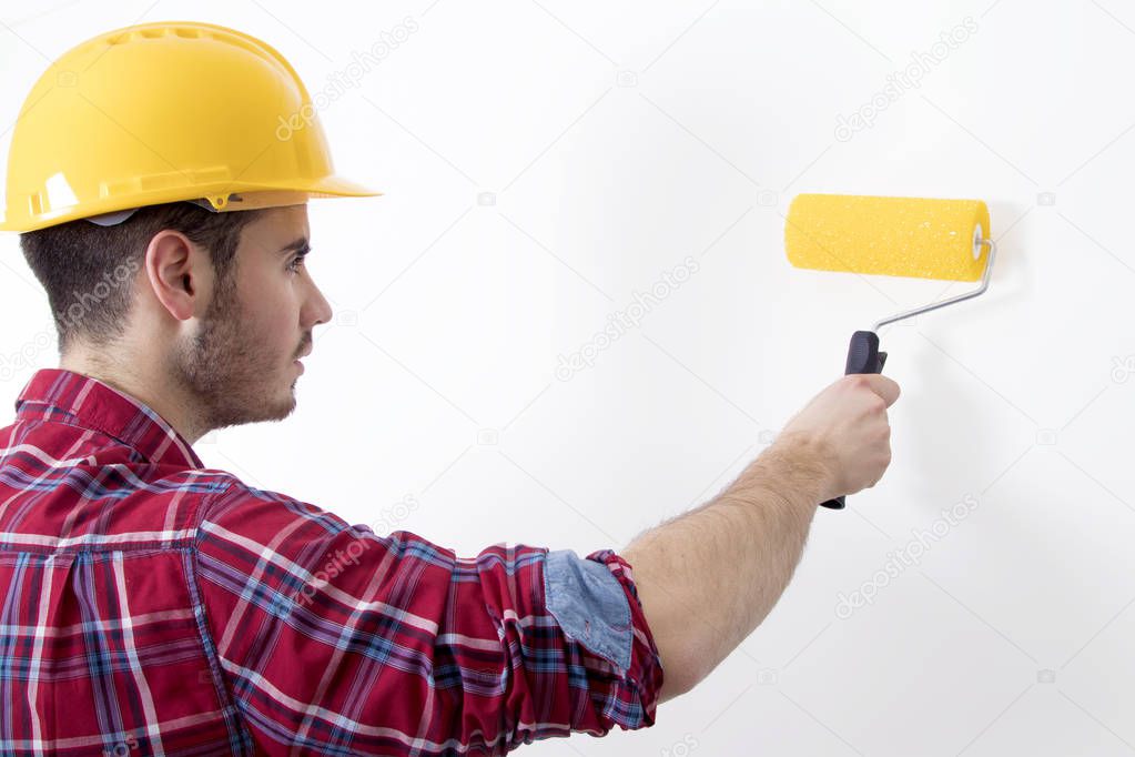 Man with brush painting on the white wall