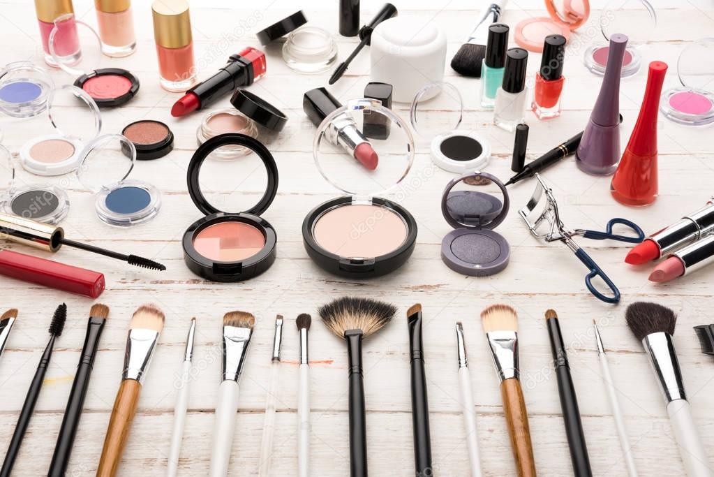 Close up view of various brushes and cosmetics for applying makeup on table
