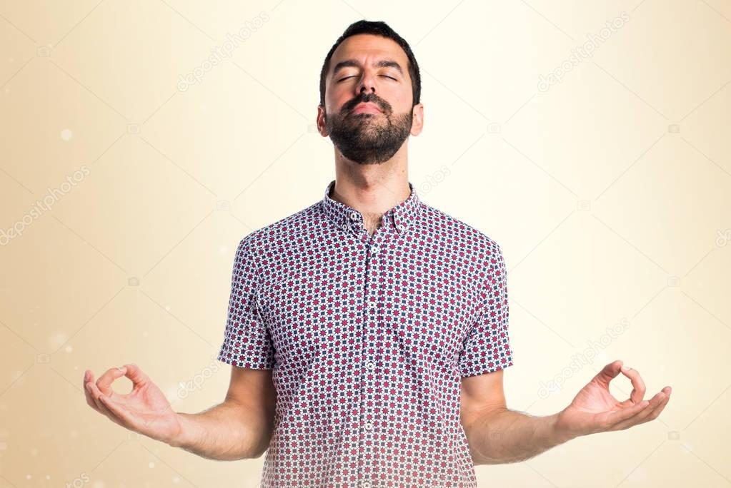 Handsome man in zen position on ocher background