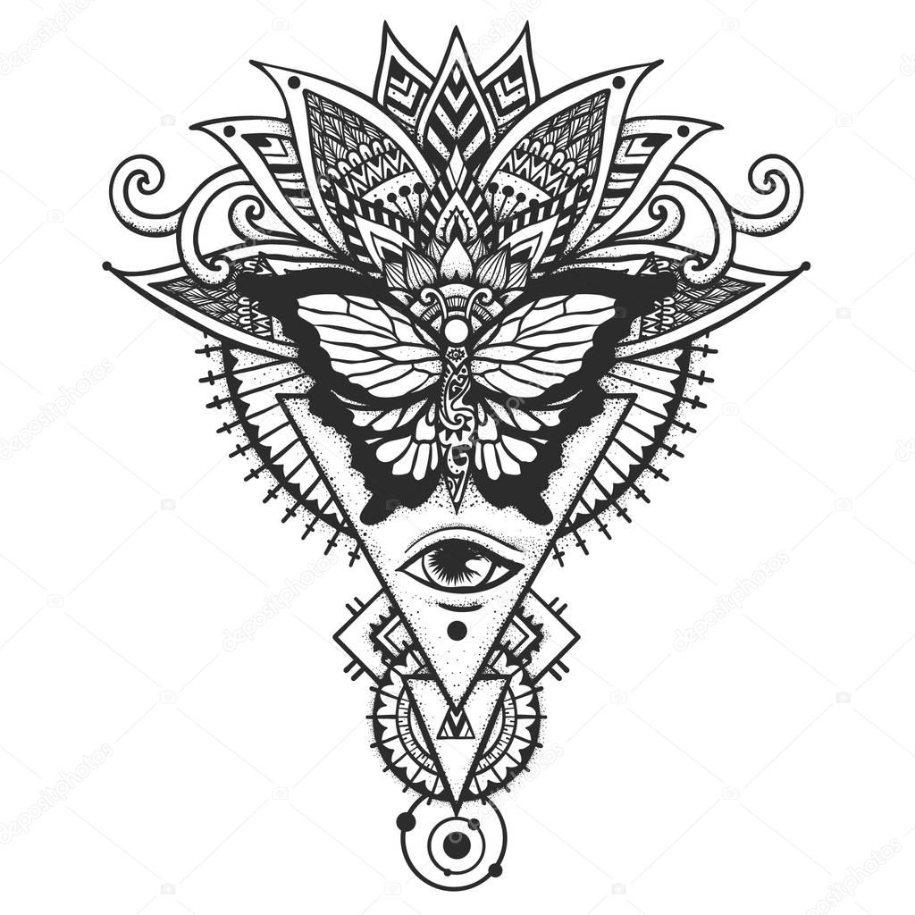 - Butterfly on ethnic leaves and all seeing eye, Freemason and spiritual symbols for back tattoo,T-Shirt and other print design. Stock Vector