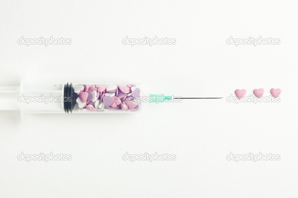 - Syringe filled with heart shaped candy on a white background