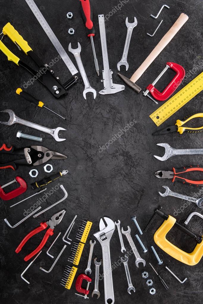 - Top view of set of construction tools on black background
