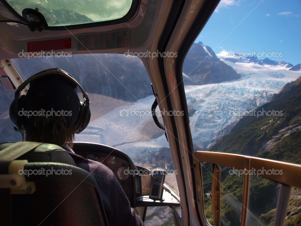 Helicopter pilot seen from behind above a glacier