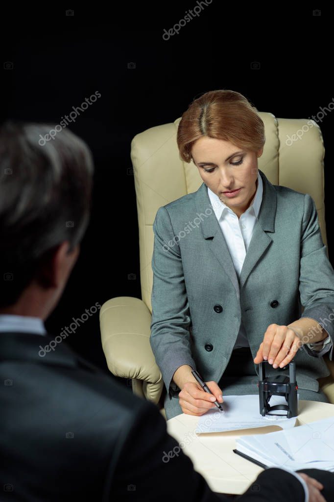 Businessman looking at businesswoman signing and stamping papers isolated on black
