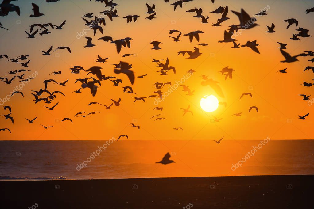 Flocks of birds above line of surf at Atlantic ocean during sunset.