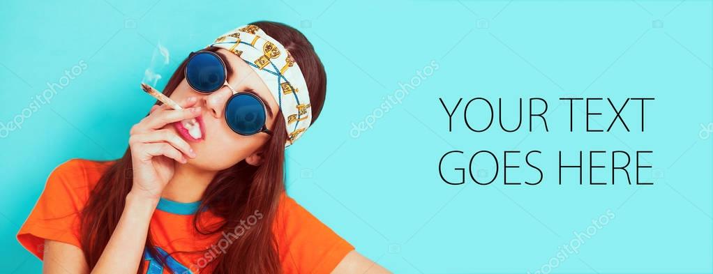 Hippy girl portrait smoking weed and wearing sunglasses, card