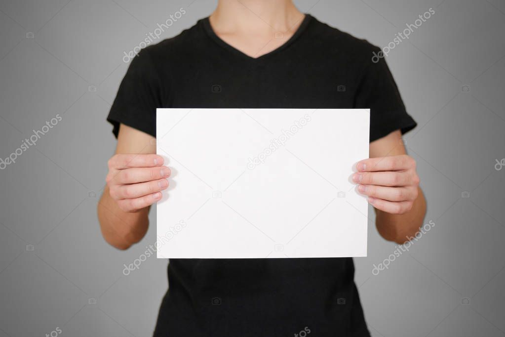 Man in black t shirt holding blank white A4 paper. Leaflet prese