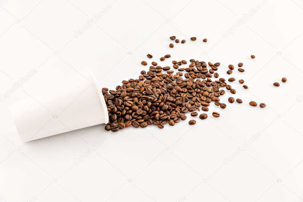 Roasted coffee beans scattered of paper cup isolated on white