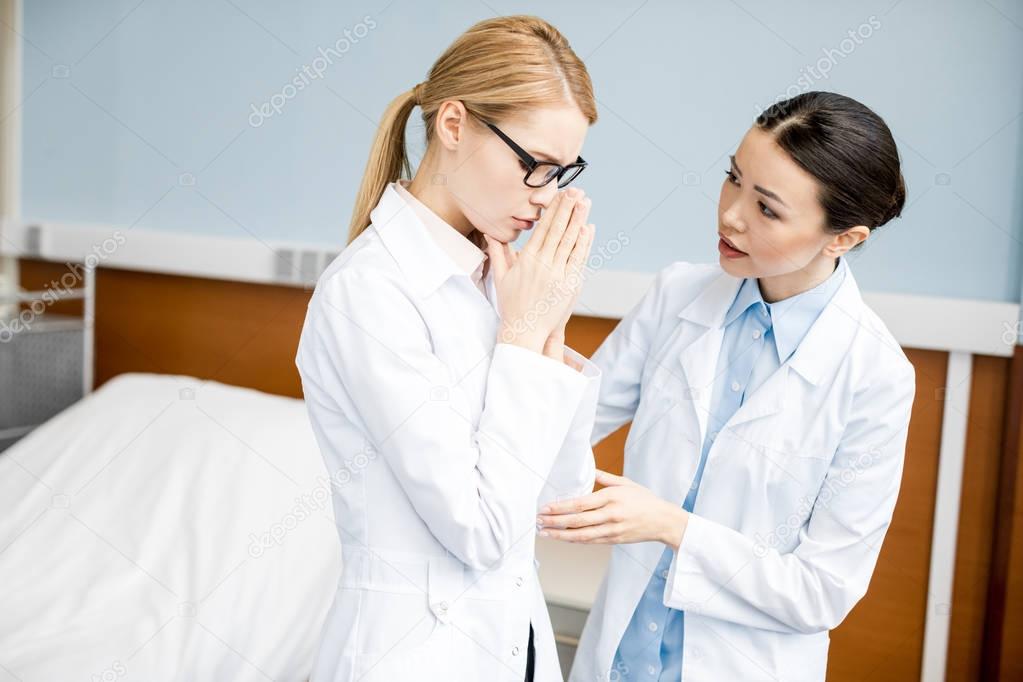 Professional young doctor supporting upset colleague standing in hospital chamber