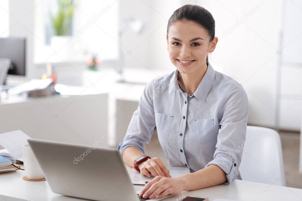 Feeling good. Positive young office worker keeping smile on her face holding hands on computer while sitting at workplace