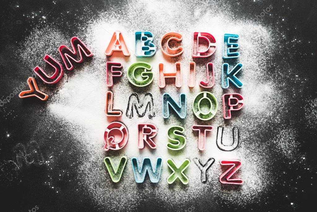 Top view of baking forms for cookies in forms of letters with floor on tabletop, baking cookies