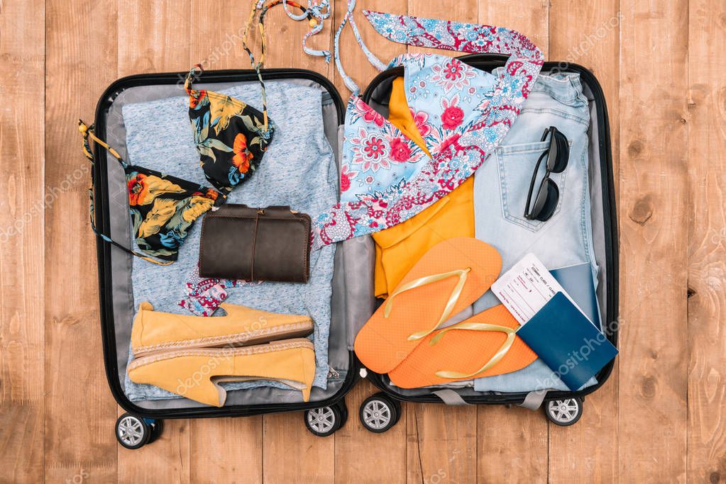 Top view of open luggage full of woman's clothes and other essential vacation items. Ready to summer vacation