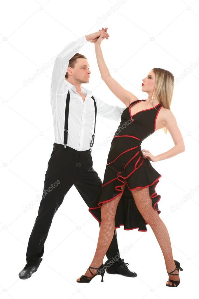 Couple of young dancers on white background