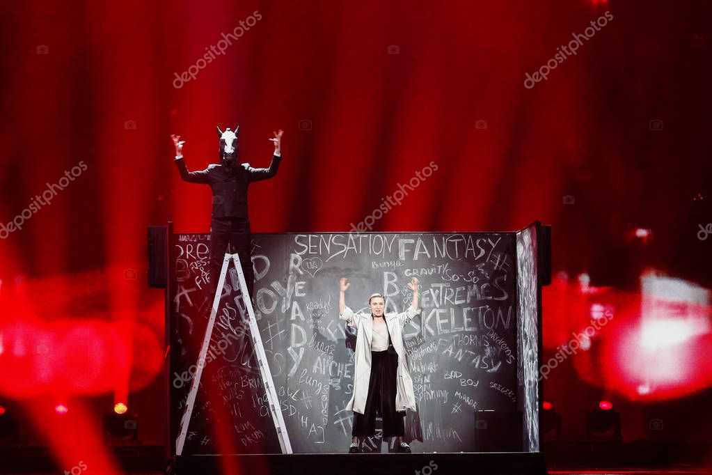 KYIV, UKRAINE - MAY 12, 2017: DiHaj from Azerbaijan at the Grand Final rehearsal during Eurovision Song Contest, in Kyiv, aUkraine