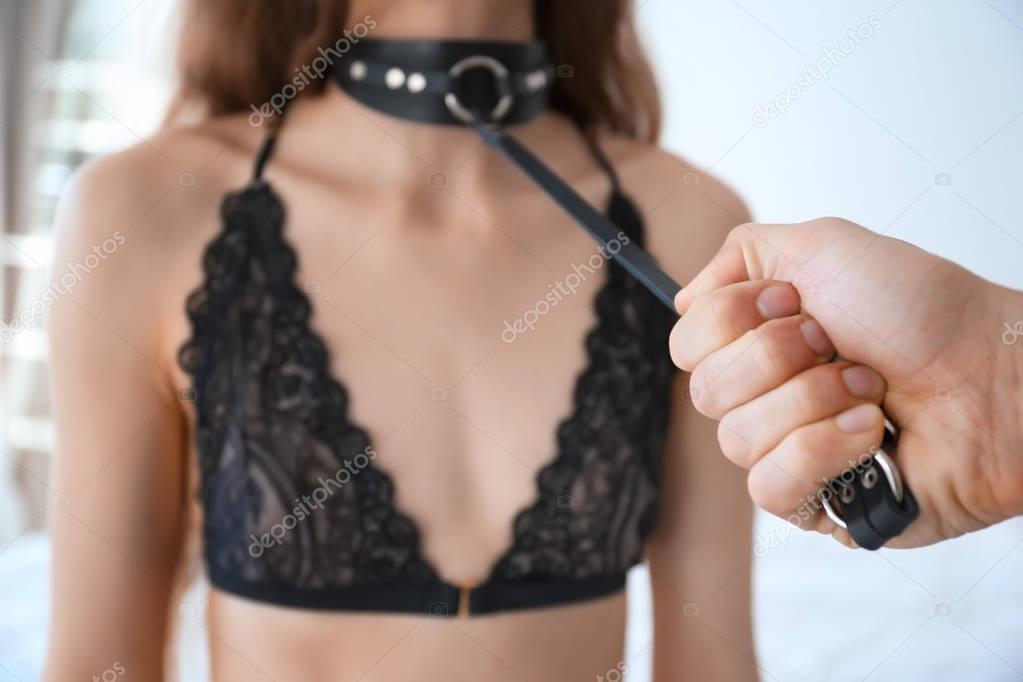 Man holding young prostitute on leash in bedroom