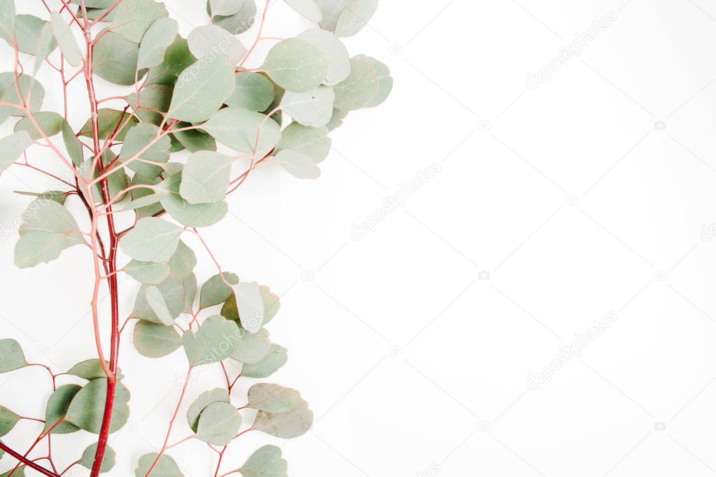 Beautiful eucalyptus branches on white background. Flat lay, top view. Lifestyle composition.
