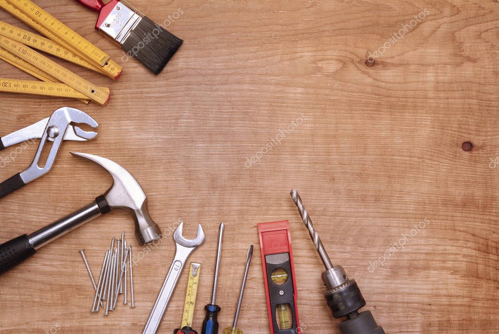 OBJECTS NOBODY CLOSEUP EQUIPMENT STUDIO WOODEN HARDWARE INDUSTRIAL CONCEPT CONSTRUCTION INDUSTRY WORK TOOL BRUSH WOOD WOODWORK INDOORS TOOLS INSIDE BUILD CARPENTRY TIMBER FLOOR REPAIR ASSORTED ASSORTMENT HAMMER CARPENTER SPANNER WORKSHOP DRILL RENOVATION RULER VARIOUS THINGS MIXED FIX ITEMS HANDYMAN NAILS FLOORING VARIED STILL LIFE COPY SPACE HOME IMPROVEMENT HAND TOOLS ADVERTISING SPACE WORK TOOLS