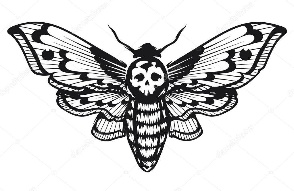 Deaths Head Hawk Moth vector illustration isolated on white. Tattoo style graphic design. Black and white vector art.