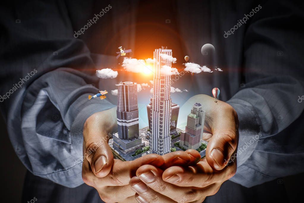 Close of male hands presenting modern city construction pattern. Mixed media