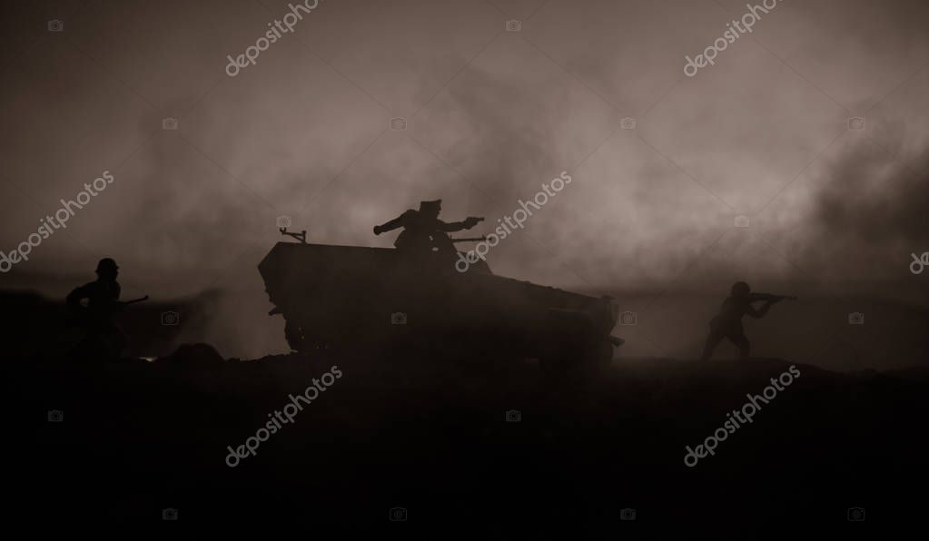 War Concept. Military silhouettes fighting scene on war fog sky background, World War Soldiers Silhouettes Below Cloudy Skyline at sunset. Attack scene. Armored vehicles. German tank in action