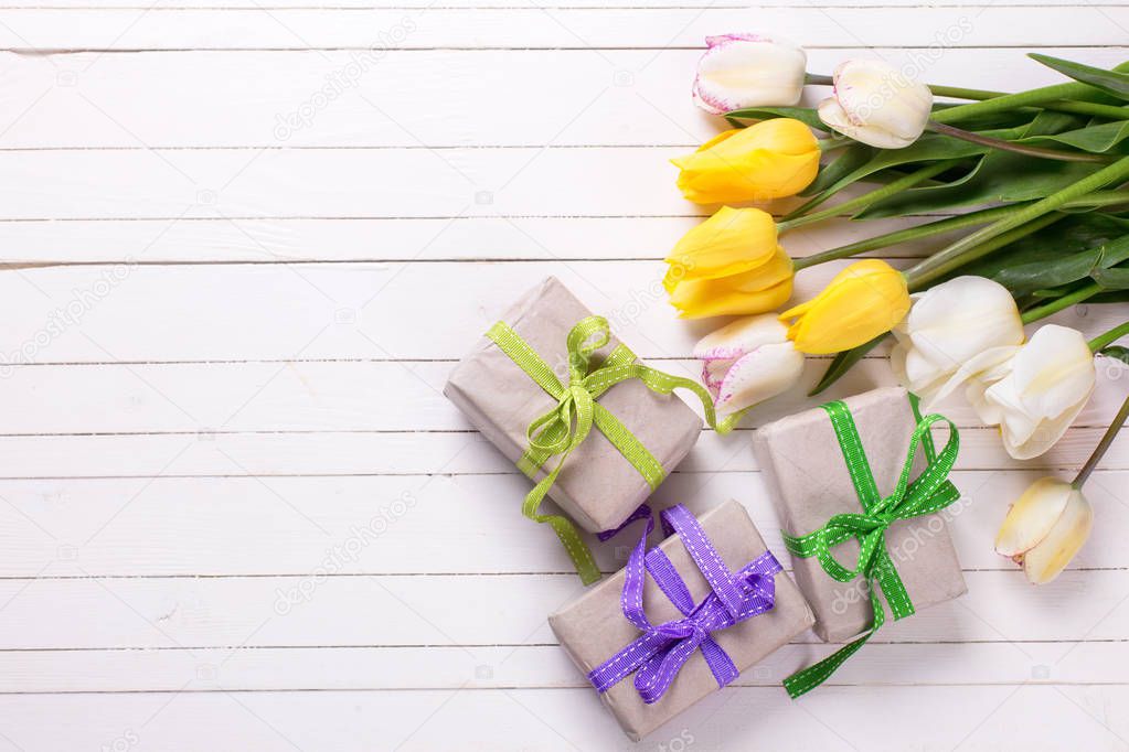 Bright yellow spring tulips and box with presents on white wooden background. Selective focus. Place for text. Top view