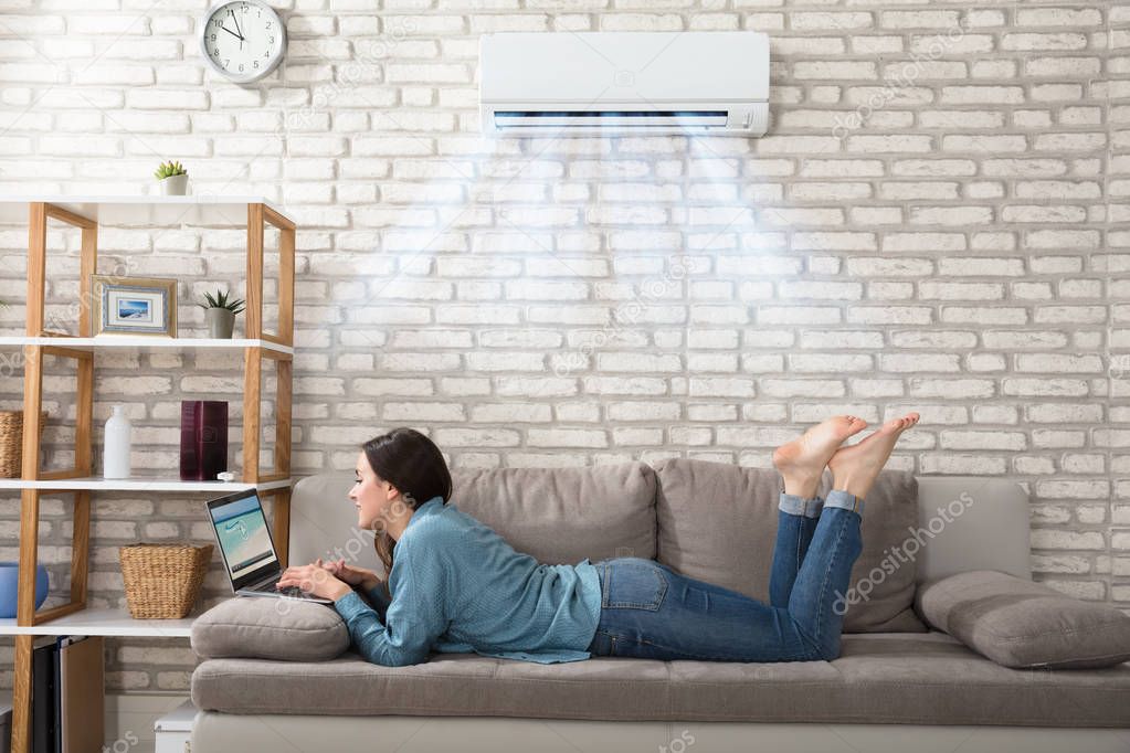 Woman Lying On Sofa Using Laptop Enjoying The Cooling Of Air Conditioner At Home