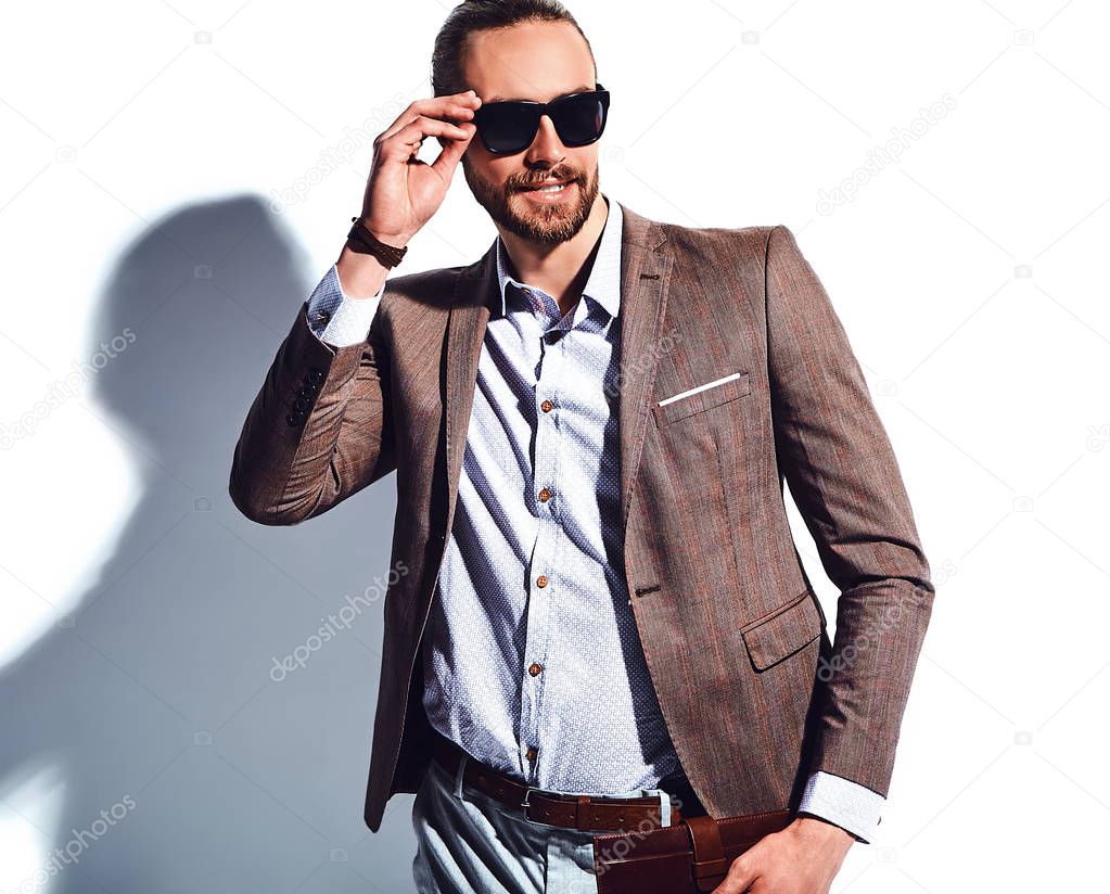 Portrait of handsome fashion stylish hipster businessman model dressed in elegant brown suit in sunglasses posing near white wall in studio. With purse in hands