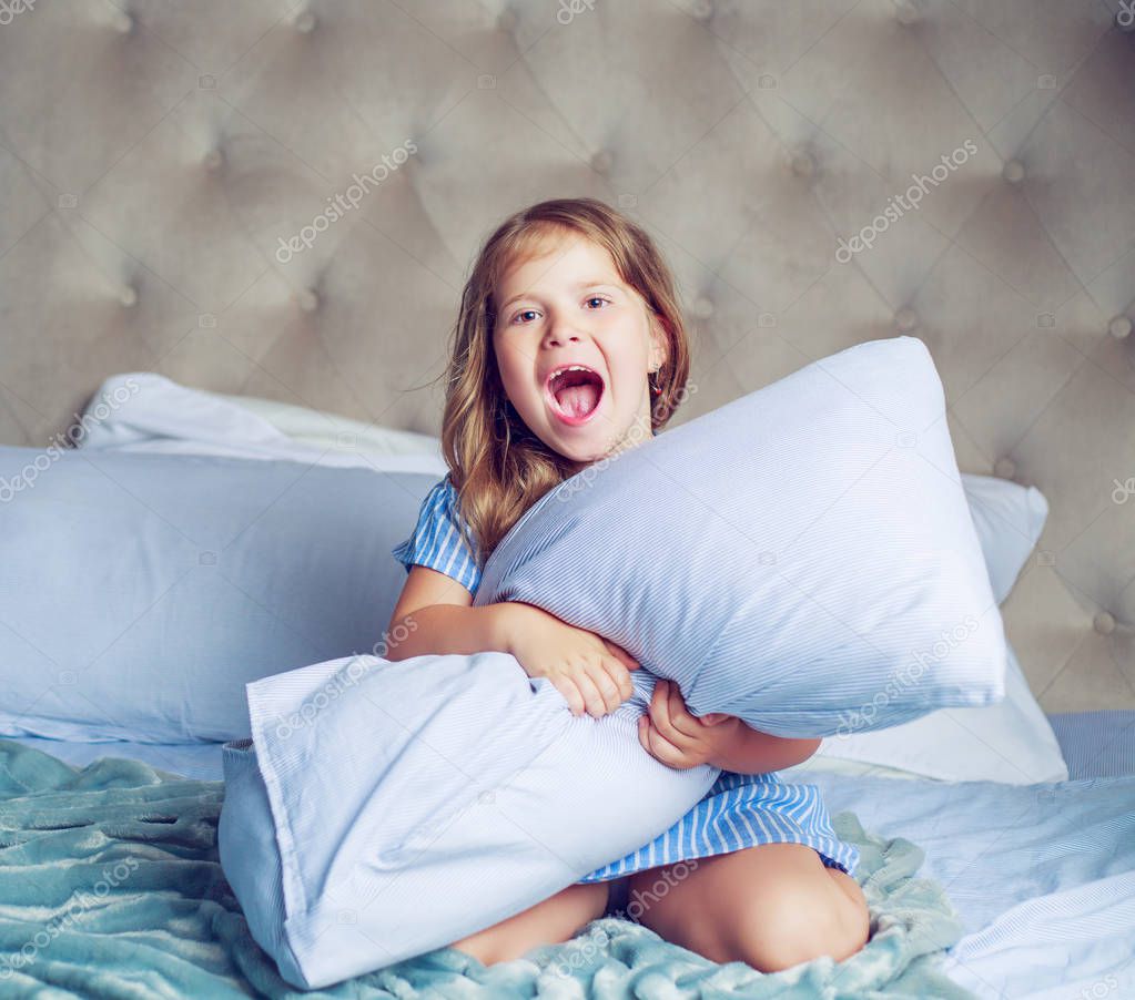 Happy little girl with a pillow in bed at home